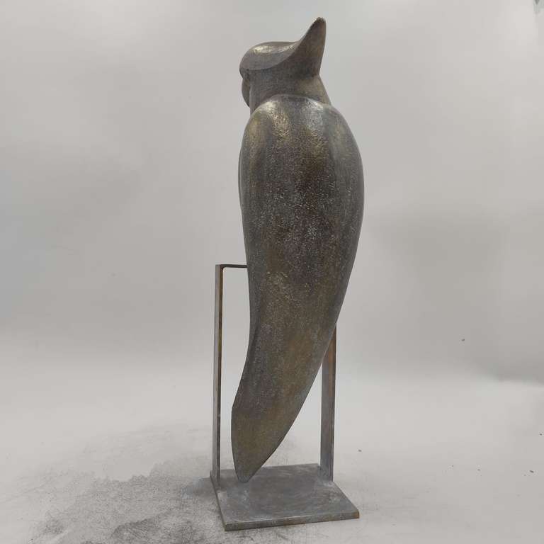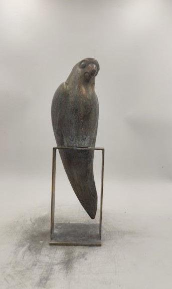 Le support a également été très travaillé, de forme géométrique, très épuré en opposition au mouvement du perroquet dans tout son corps. La patine est blanche, en transparence pour rappeler le plumage de l'oiseau tout en capitalisant sur la beauté du bronze.